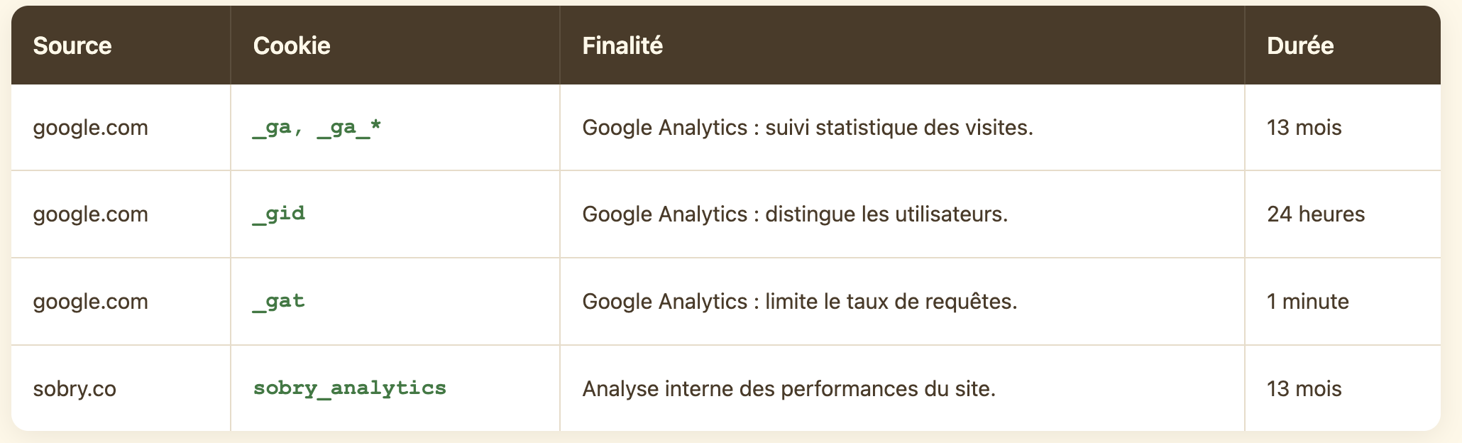 Voici la liste détaillée des cookies utilisés sur sobry.co, classés par catégorie.